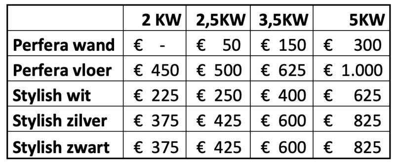 Bij de standaardinstallatie zijn 2KW Perfera wandmodellen inbegrepen. Voor de meerkosten voor andere modellen en vermogens gelden per binnendeel de volgende meerkosten: